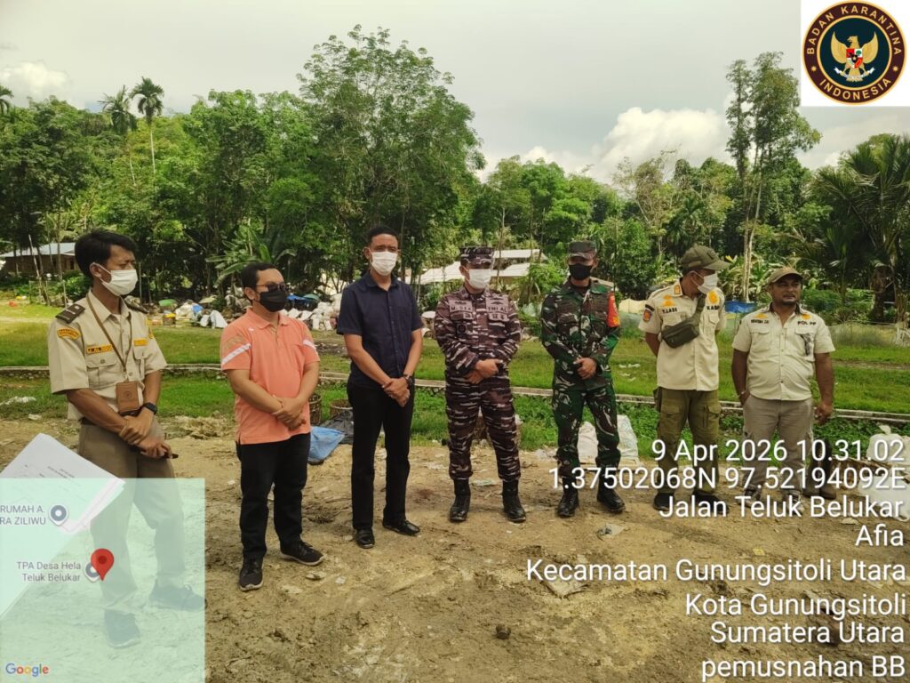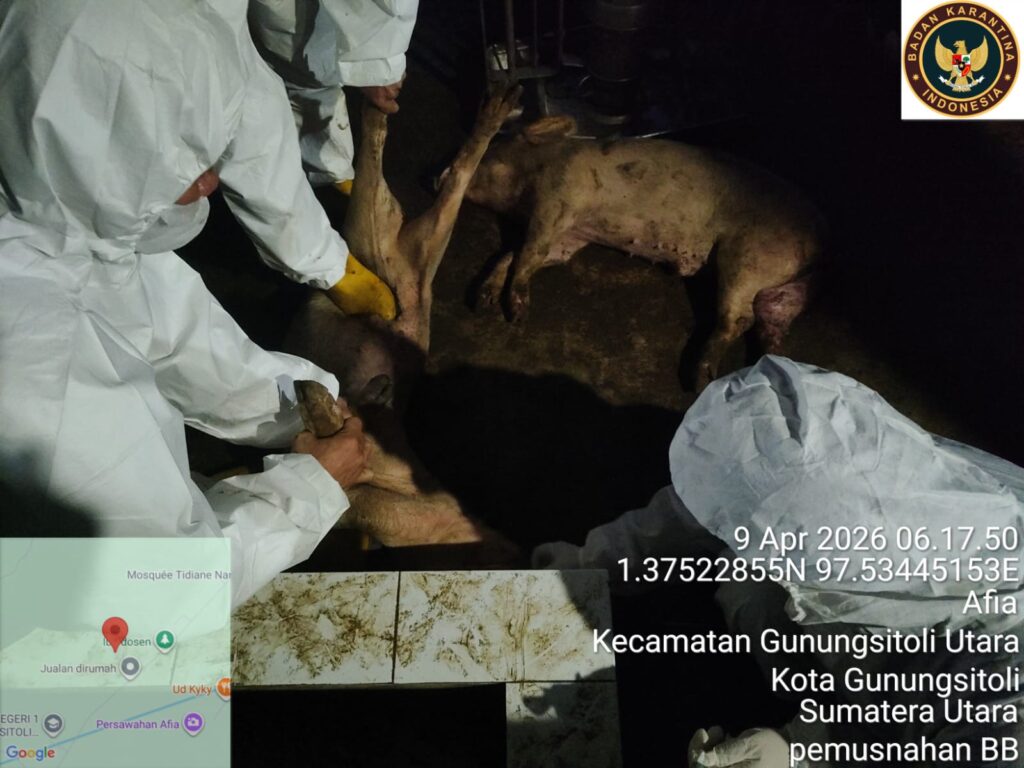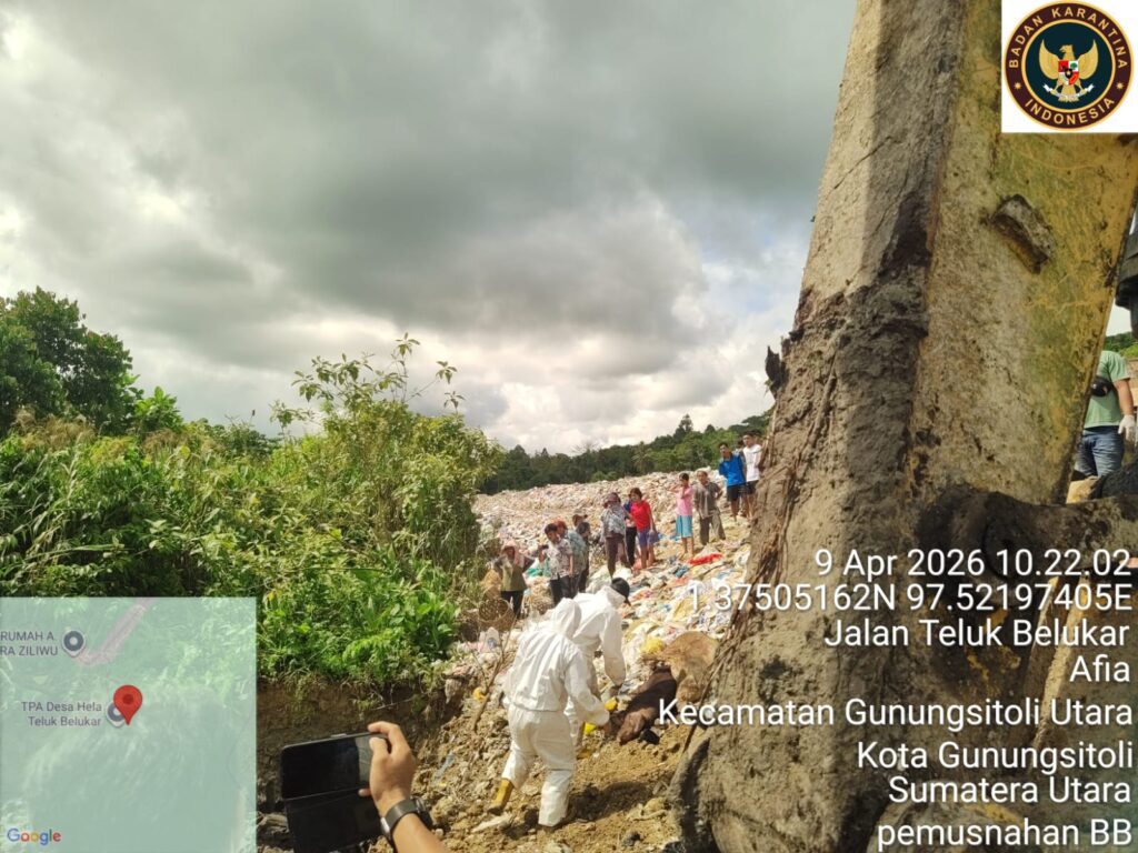 Karantina Hewan, Ikan, dan Tumbuhan (Karantina) Pos Kota Gunungsitoli melakukan pemusnahan barang bukti media pembawa Hama Penyakit Hewan Karantina (HPHK) berupa puluhan ekor ternak babi di Tempat Pembuangan Sampah (TPS) Desa Hela, Kecamatan Gunungsitoli Utara, Kamis (9/4/2026).