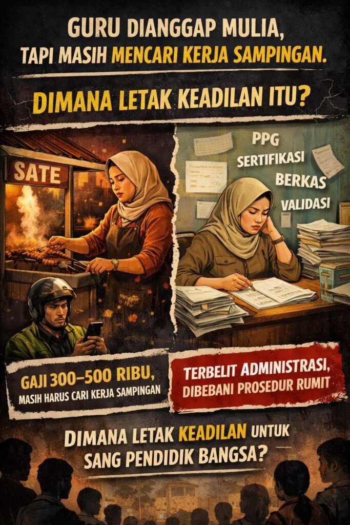 Guru sibuk memenuhi syarat. Guru sibuk mengikuti prosedur. Sementara di sisi lain, ia masih harus memikirkan pekerjaan tambahan demi menutup kebutuhan hidup. Lalu dimana letak keadilan itu?Jika pendidikan adalah prioritas, mengapa pendidiknya masih berjuang untuk bertahan?Jika profesionalisme dituntut, mengapa kesejahteraan tidak dipastikan lebih dulu? Keadilan bukan sekadar aturan.