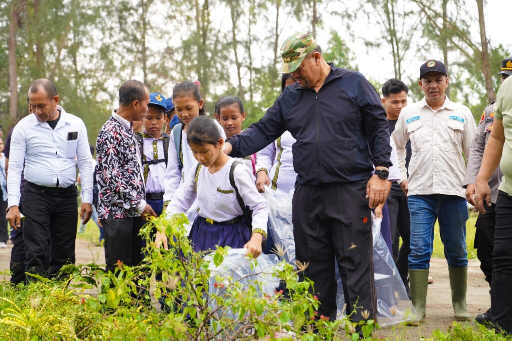 Usai penanaman pohon, Bupati Batu Bara bersama masyarakat dan para siswa turut serta memungut sampah plastik dan limbah lainnya di sepanjang pantai.