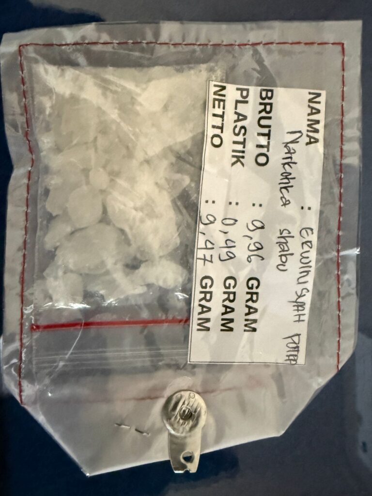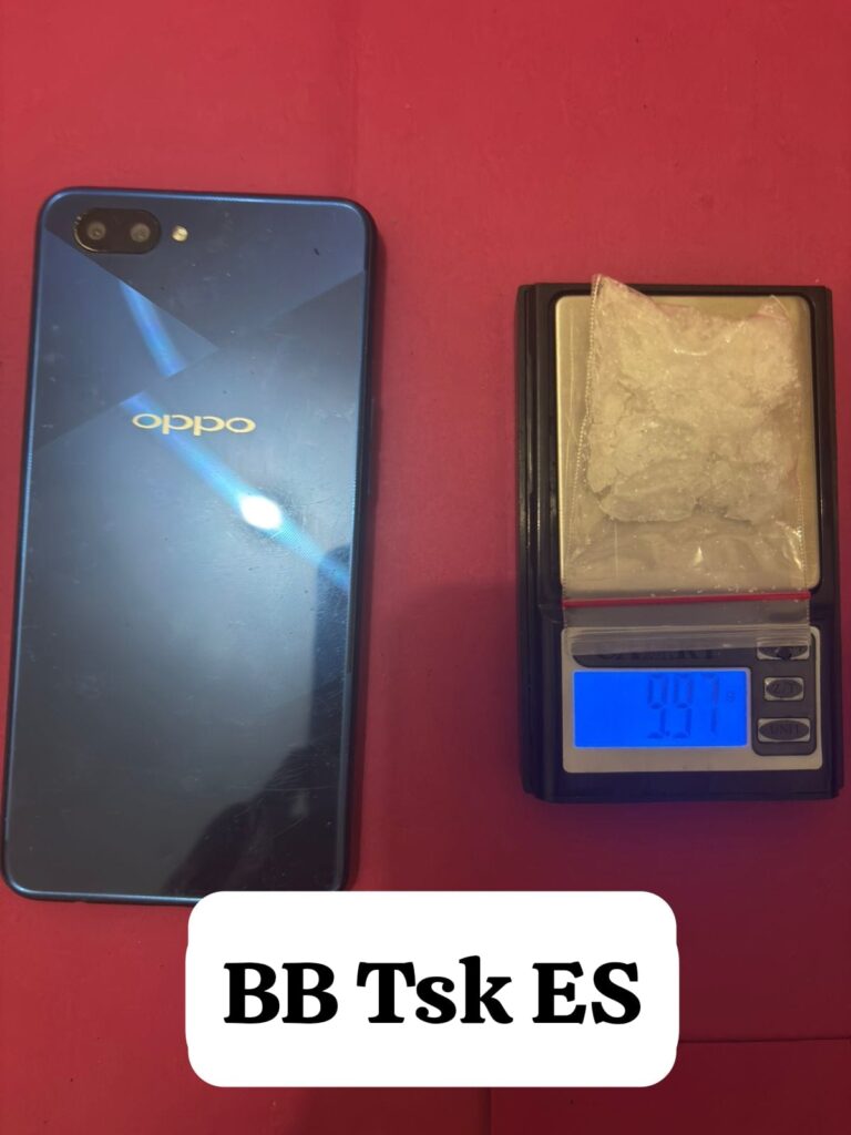 Dari hasil penangkapan dan penggeledahan, petugas menemukan barang bukti berupa satu plastik klip transparan ukuran sedang berisi narkotika jenis sabu dengan berat bruto 9,97 gram, serta satu unit handphone merk Oppo warna biru. Tersangka mengakui bahwa barang haram tersebut adalah miliknya.